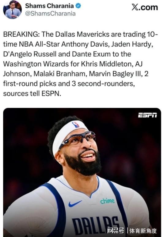 "轟!"當(dāng)Shams的爆料如驚雷般炸響,整個(gè)籃球世界瞬間沸騰——獨(dú)行俠竟將濃眉哥安東尼·戴維斯、拉塞爾、哈迪和??怂_姆打包送往華盛頓,換回米德?tīng)栴D領(lǐng)銜的七人豪禮(含5個(gè)選秀權(quán))!這記堪比好萊塢大,讓無(wú)數(shù)球迷扼腕嘆息:我們終究無(wú)緣見(jiàn)證歐文(2011狀元)+弗拉格(2025狀元熱門)+濃眉哥(2012狀元)的夢(mèng)幻三狀元組合!